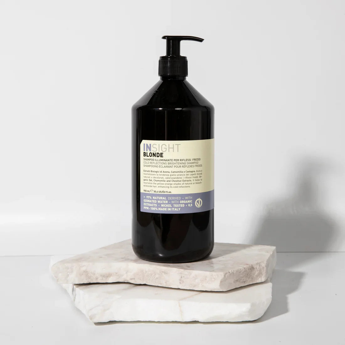 INSIGHT BLONDE Cold Reflections Brightening Shampoo It helps to neutralize the yellow-orange hues of natural or bleached blonde hair, enhancing its cool reflections.