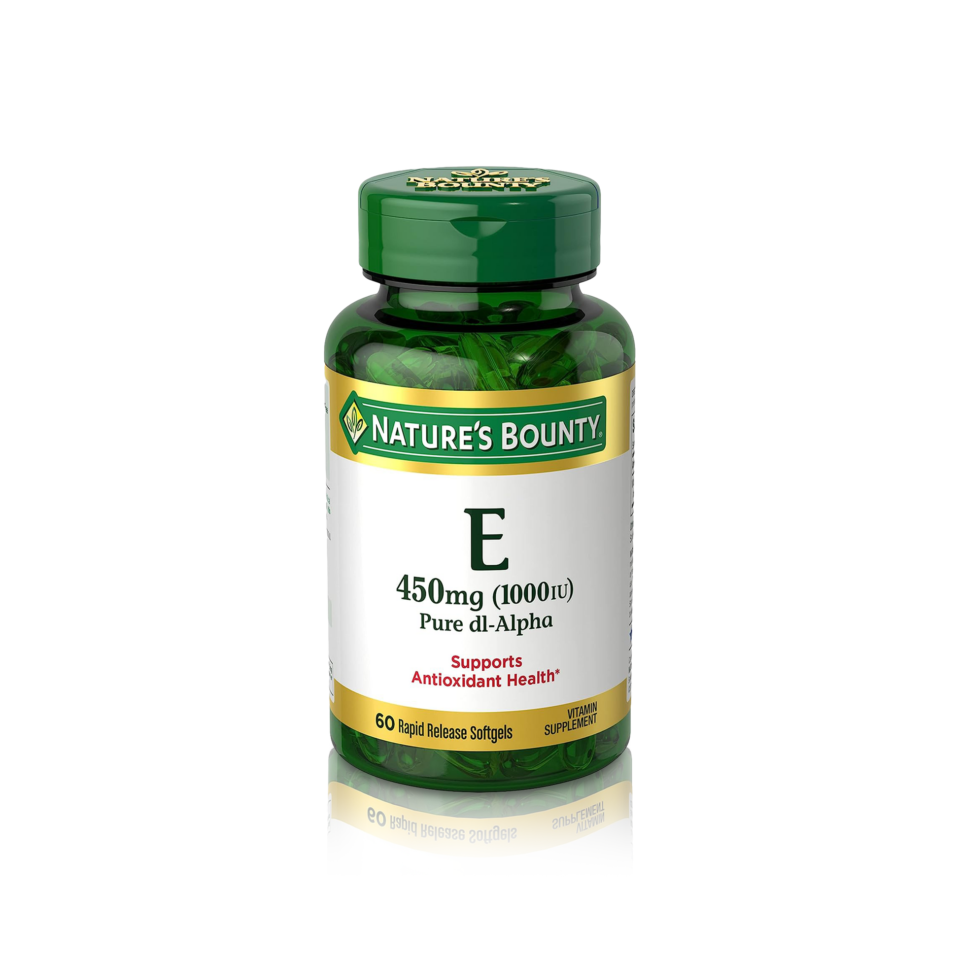 Nature's Bounty Vitamin E Pure DL-Alpha 450 mg (1,000IU) is the perfect addition to your daily wellness routine. This high potency multivitamin supplement provides you with a powerful dose of 450 mg (1,000 IU) of Vitamin E, as dl-Alpha Tocopheryl Acetate, in each quick release softgel.