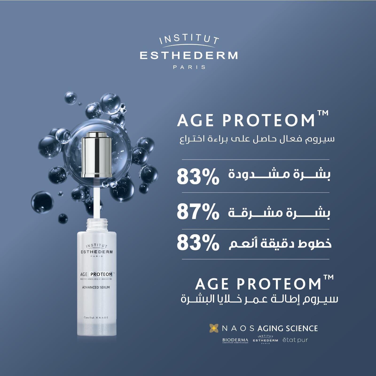 إنه السيروم الأول الذي يحمي ويقوي بروتين الخلايا( بما في ذلك الكولاجين والإيلاستين) بشكل دائم لضمان حماية طويلة الأمد لشباب البشرة. 83% لاحظوا أن بشرتهم أصبحت مشدودة وتقلصت التجاعيد بعد 28 يومًا! تم تركيبه باستخدام تقنيات حصرية ومكونات نشطة حاصلة على براءة اختراع: براءة اختراع للمياه الخلوية - مستوحاة من الماء الموجود بشكل طبيعي في الجلد. إنه يحسن طاقة خلايا الجلد إلى مستوى الطاقة التي تمتلكها الخلايا الشابة. لإطالة نضارة البشرة. AGE PROTEOM™ ADVANCED BIOTECHNOLOGY - مستخلص فريد من بكتيريا الثلج القادرة على التجدد في ظل الظروف القاسية - مقاومة فائقة للأشعة فوق البنفسجية والبرد والضغوط. فهو يحمي ويقوي البروتينات، بما في ذلك بروتينات إصلاح الحمض النووي والكولاجين والإيلاستين. إنه يحمي البروتينات من عملية التأكسد، لضمان تماسك البشرة، وإشراقها، وتوازنها، وكثافتها. لإبطاء شيخوخة الجلد. يعتبر Age Proteom بمثابة عناية مثالية لجميع علاجات الطب التجميلي، مما يعزز التأثيرات. يوصى به للأشخاص الأصغر سنًا، كعلاج وقائي يبطئ شيخوخة الجلد، وكذلك للأشخاص الأكثر نضجًا، لاستهداف علامات الشيخوخة.