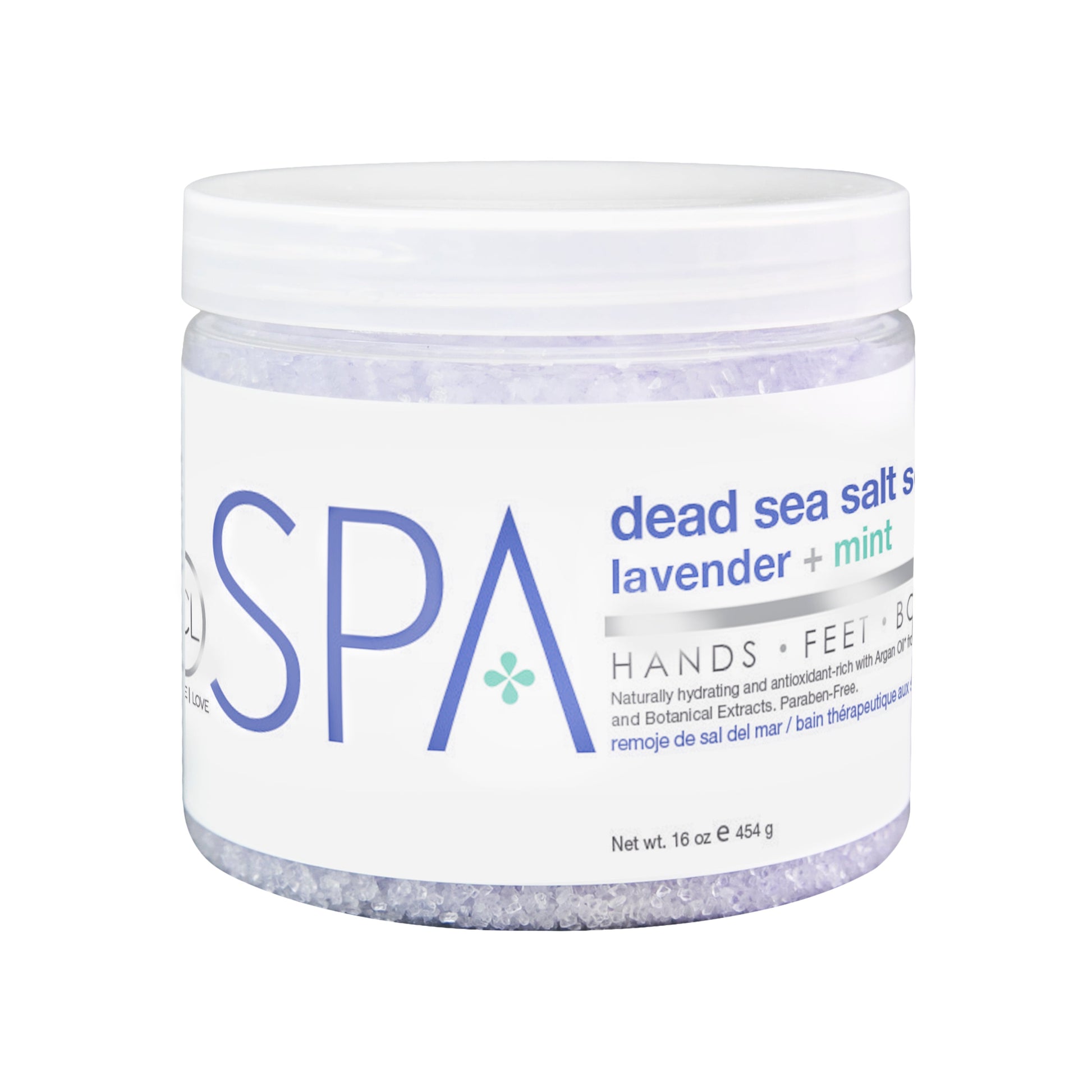 The Be Care Love Lavender+Mint Sea Salt Soak comes in a 454 g container, designed for versatile use in your self-care routine.