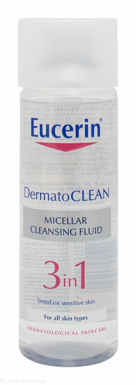 Eucerin DermatoCLEAN 3 in 1 Micellar Cleansing Fluid is a refreshing, cleansing solution that removes all water-soluble eye and face make-up and helps skin to breathe better.Has been tested on, and proven to be compatible with, sensitive skin and eyes.A 3 in 1 formula that cleanses, removes make up, and hydrates.Suitable for use with contact lenses