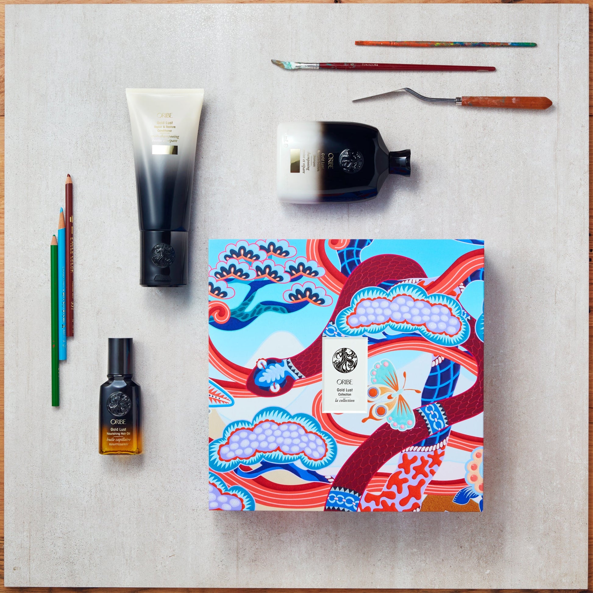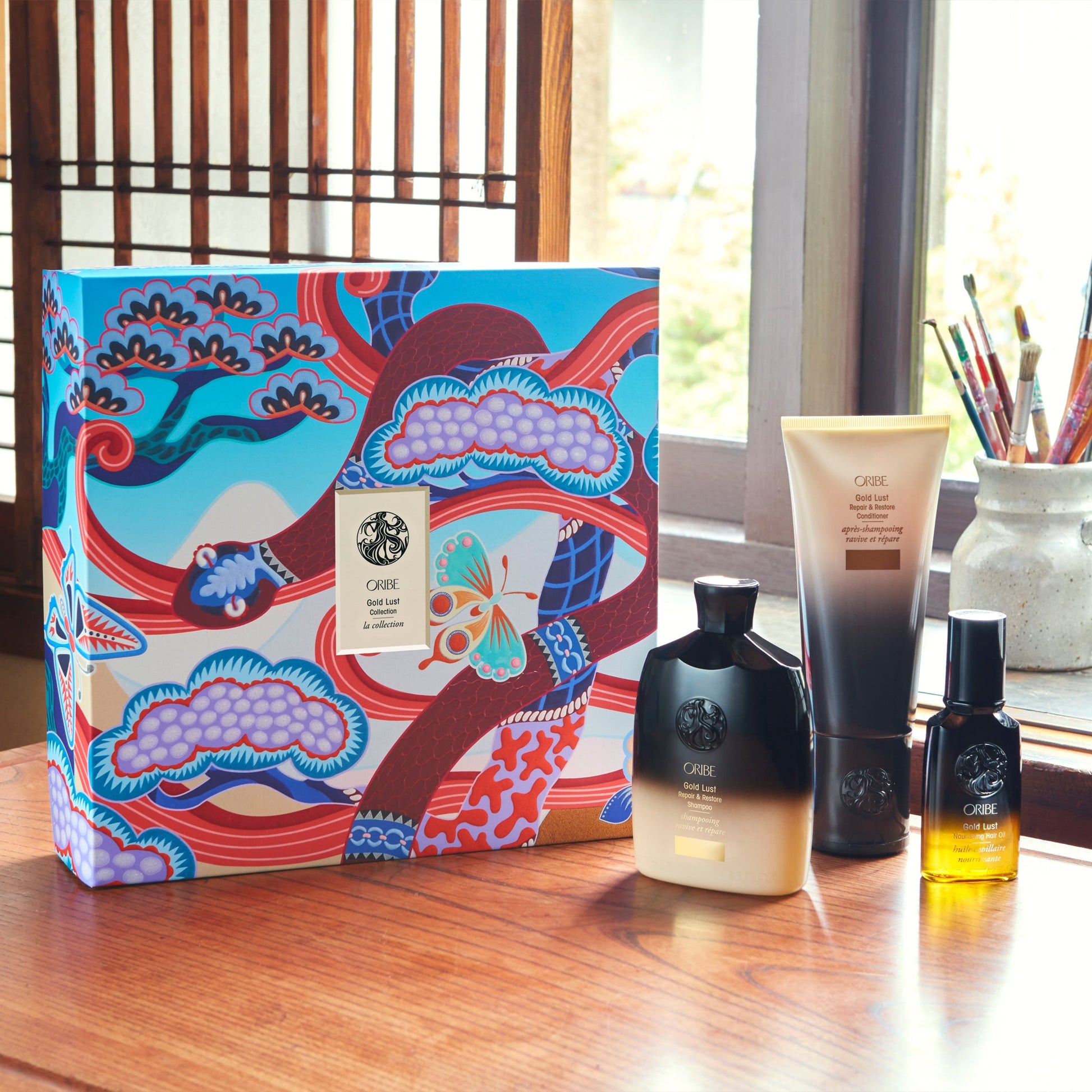 The fountain of youth for hair. Gold Lust Shampoo rejuvenates hair to its healthiest prime, while Gold Lust Conditioner undoes the damage of time — and style. A single drop of Gold Lust Nourishing Hair Oil on wet hair seals in shine before heat styling, and smooths in softness and luster on dry hair. Designed for gifting (and collecting) in a Oribe limited-edition box featuring original artwork by Kohei Kyomori.