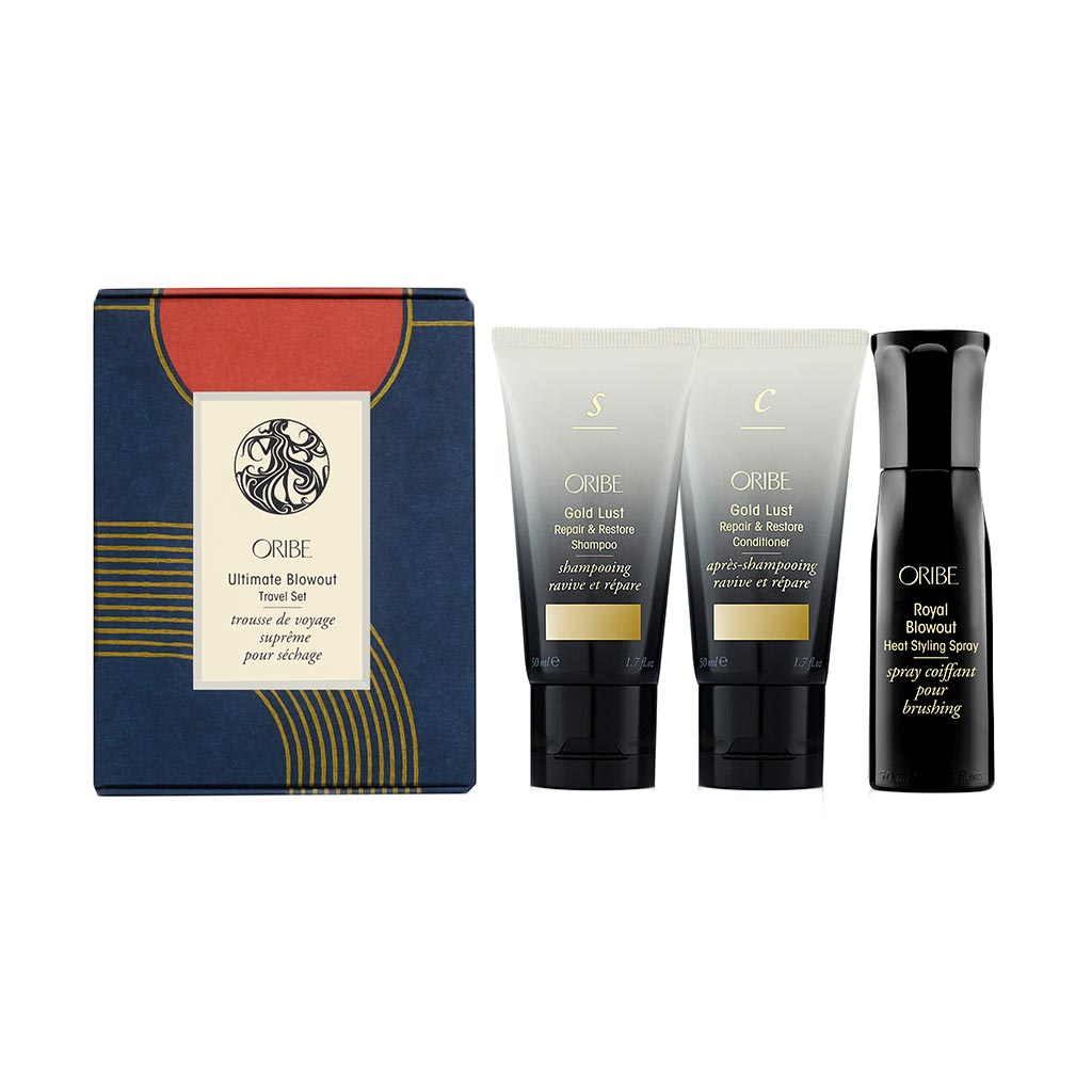 The perfect travel companion with mini and intensely nourishing Gold Lust Repair & Restore Shampoo and Conditioner, alongside the ultimate lightweight Royal Blowout Heat Styling Spray to smooth and speed up drying time, repair split ends and restore strands for strengthened hair with body and shine.