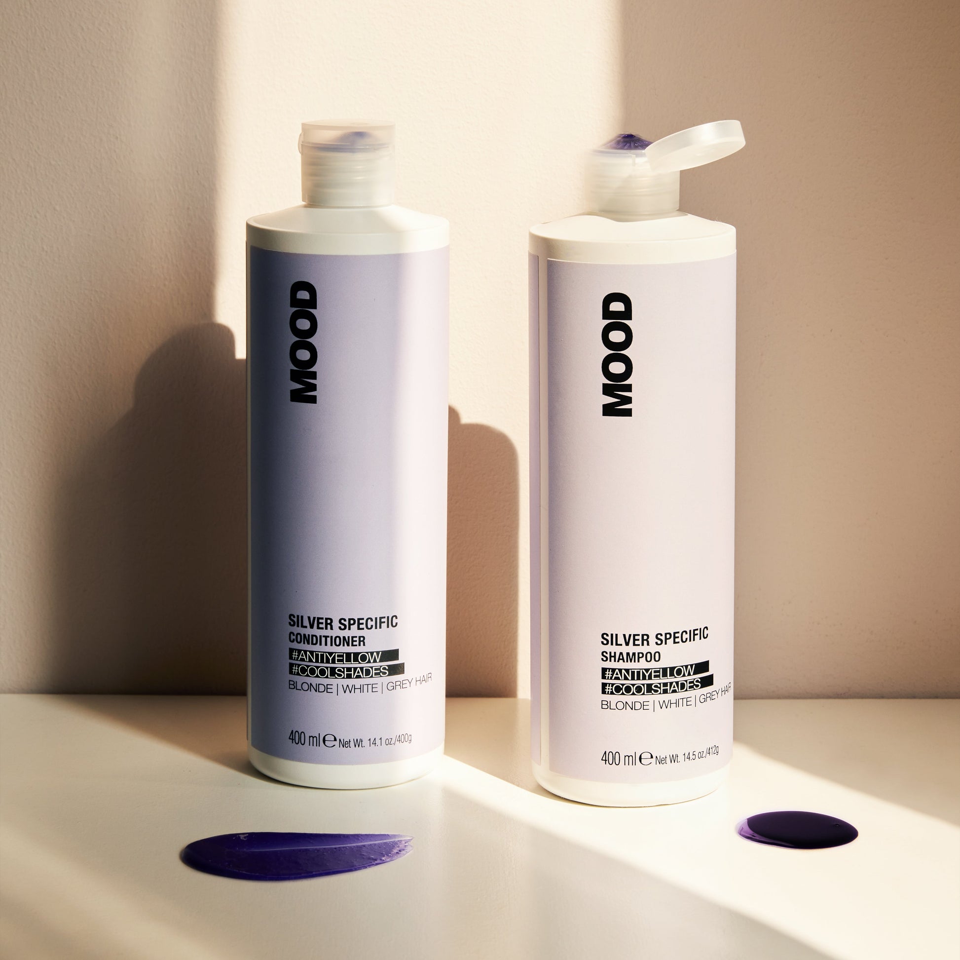 All of the products in the Mood Silver Specific line contain Blueberry extracts. They are formulated to cleanse white or grey, bleached or very blond hair with yellowish tones. Its function is to naturalise these yellow tones that leave hair looking unkempt.