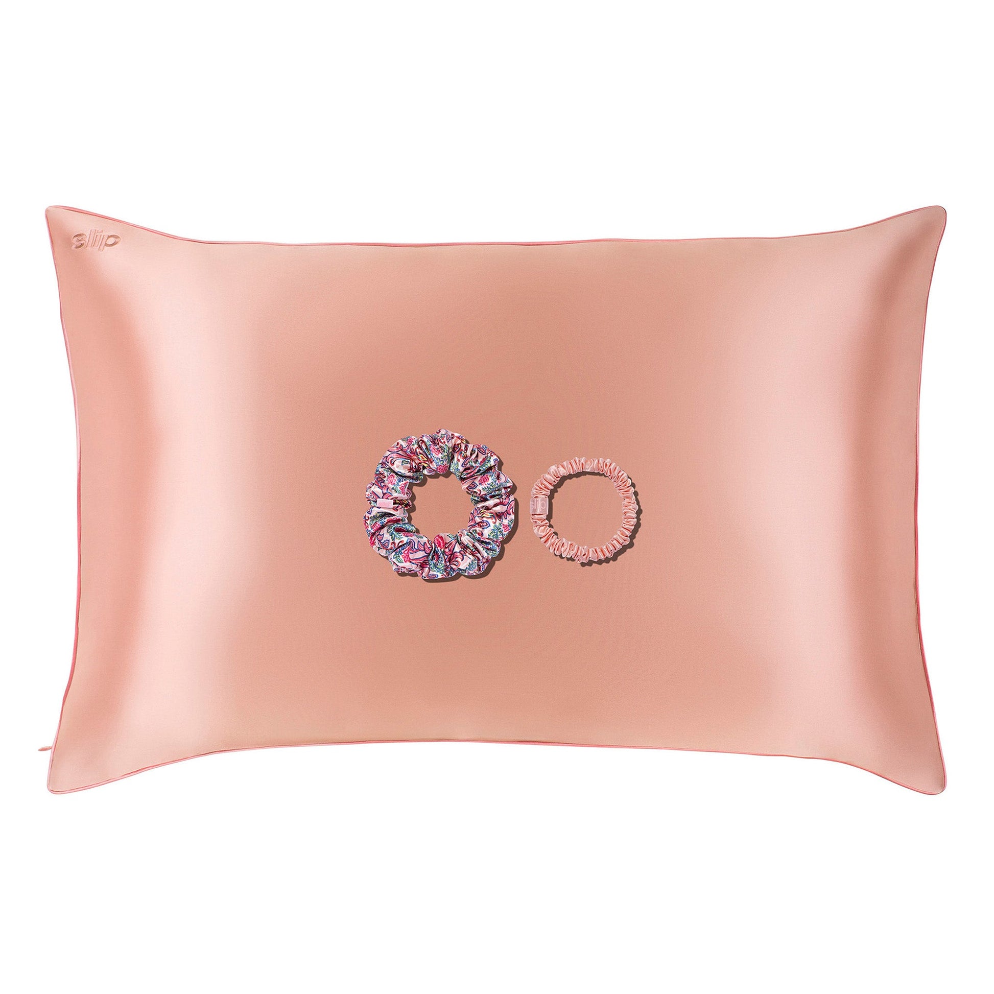 Includes: 1 x rose pure silk queen/international standard (51 x 76cm/ 20" x 30") pillowcase with rose piping and an invisible zipper closure | 1 x large chelsea slipsilk™ scrunchie | 1 x rose slipsilk™ skinny scrunchie