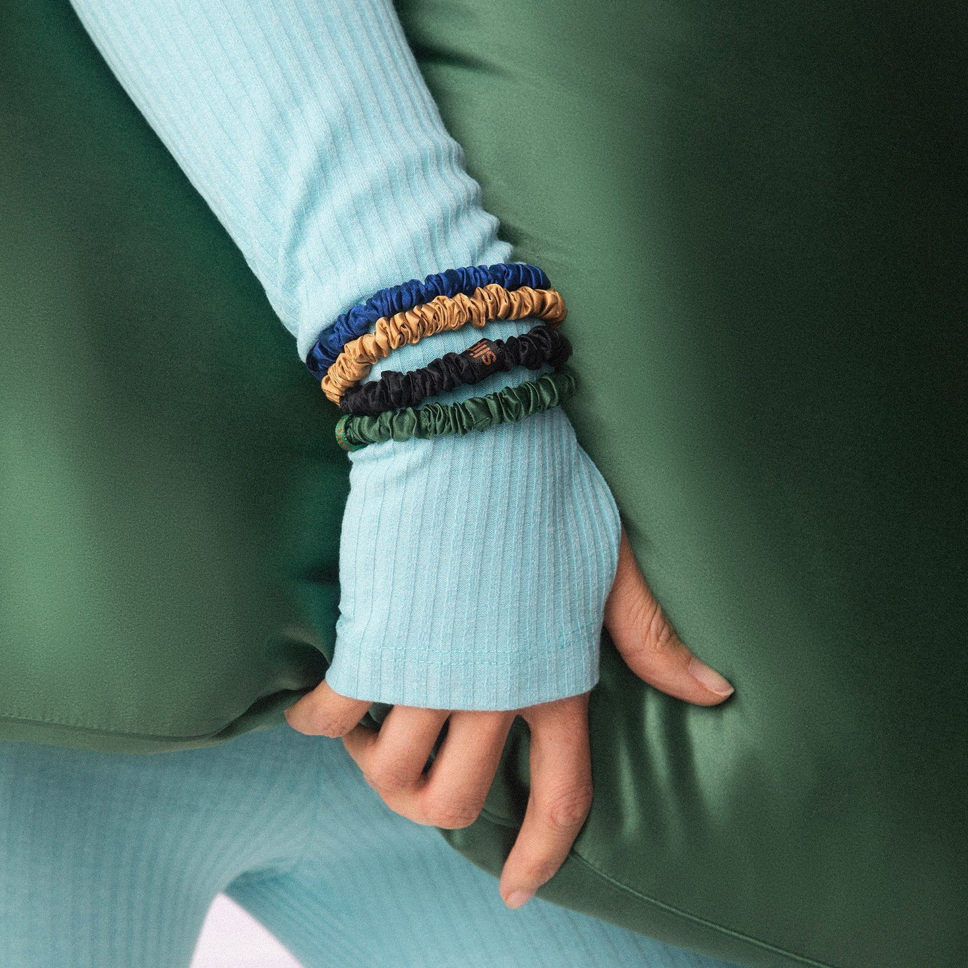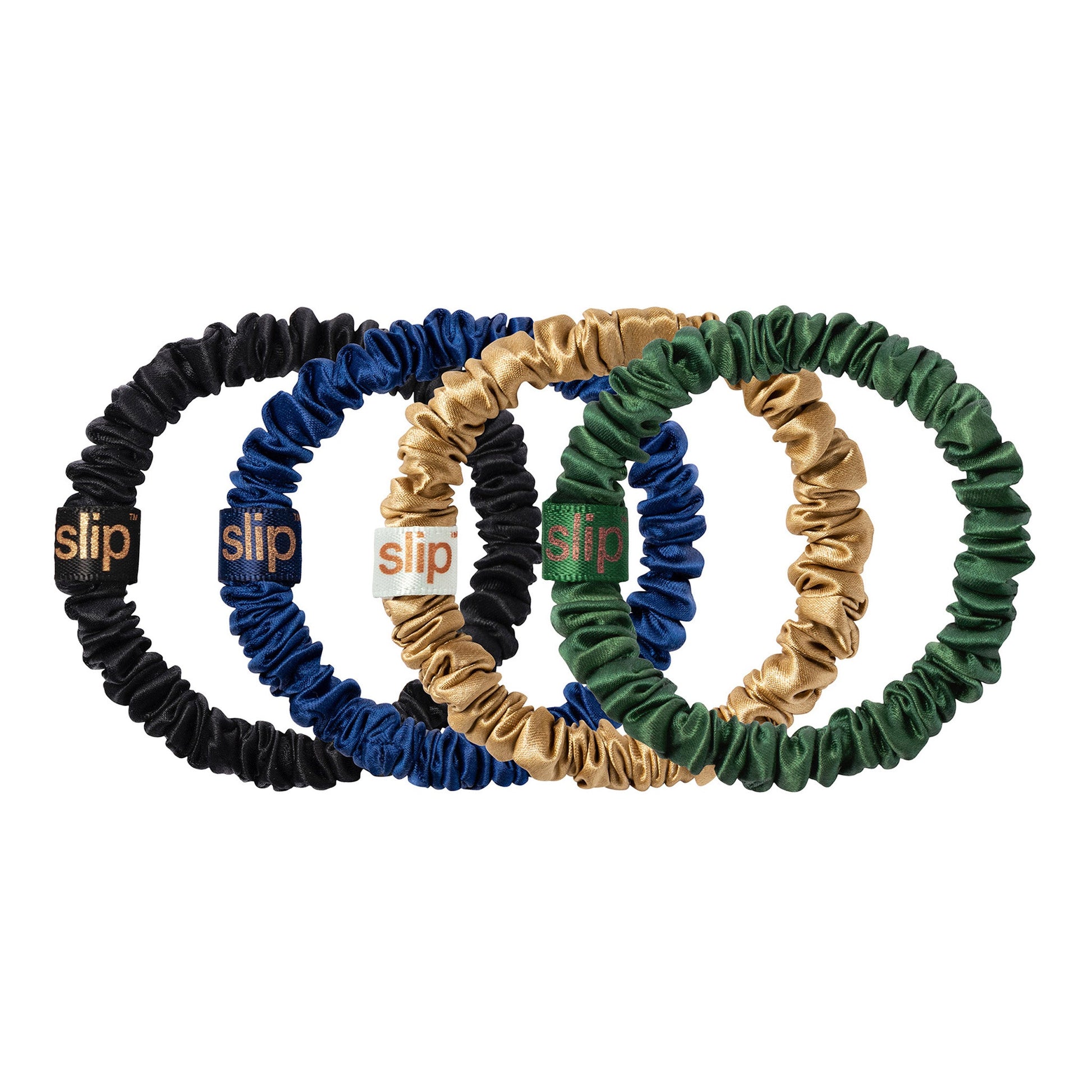 Includes: 1 x black / 1 x royal blue / 1 x gold / 1 x moss green pure silk skinny scrunchies.