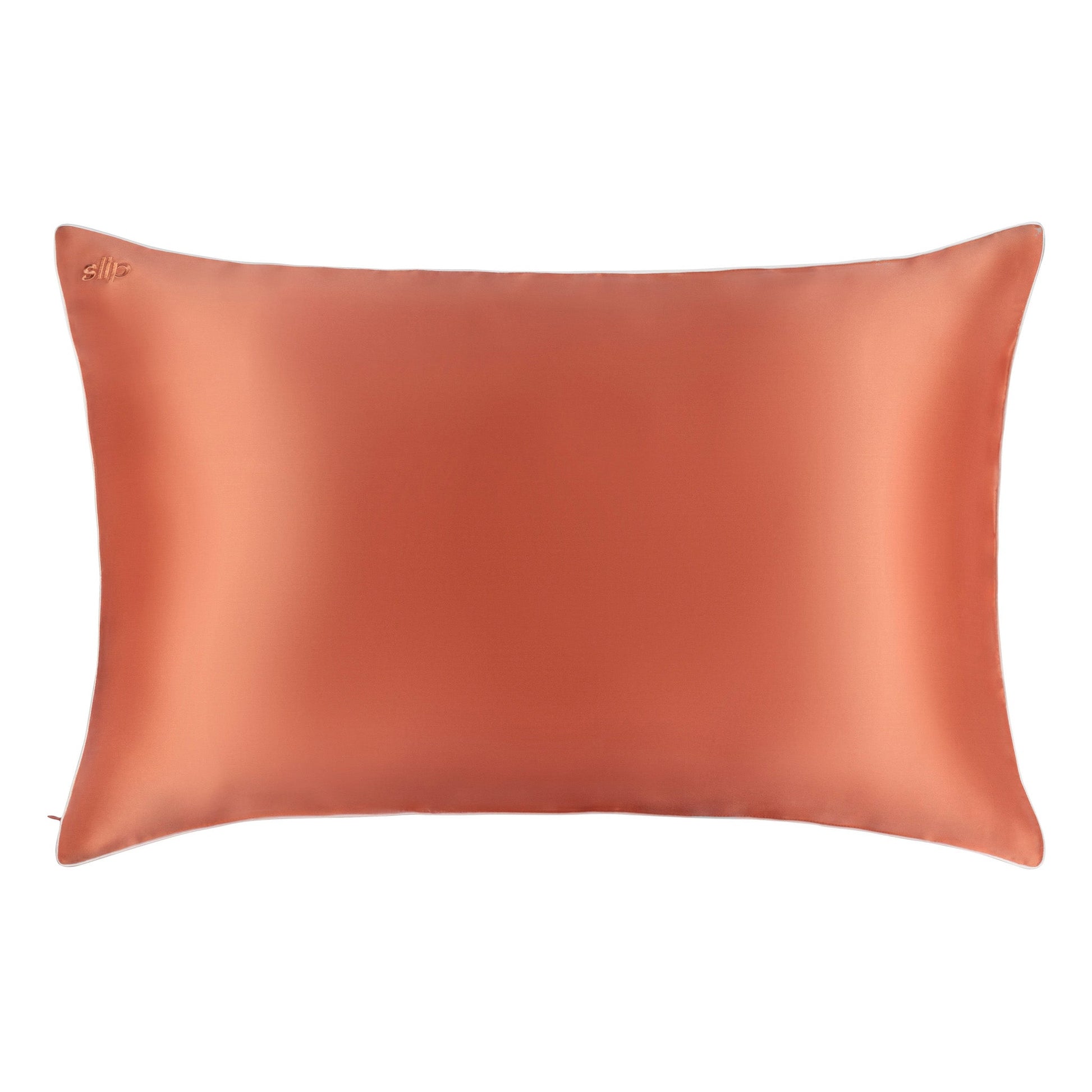 Includes: 1 x coral sunset pure silk queen pillowcase with white piping and invisible zipper closure (20" x 30" / 51cm x 76cm).