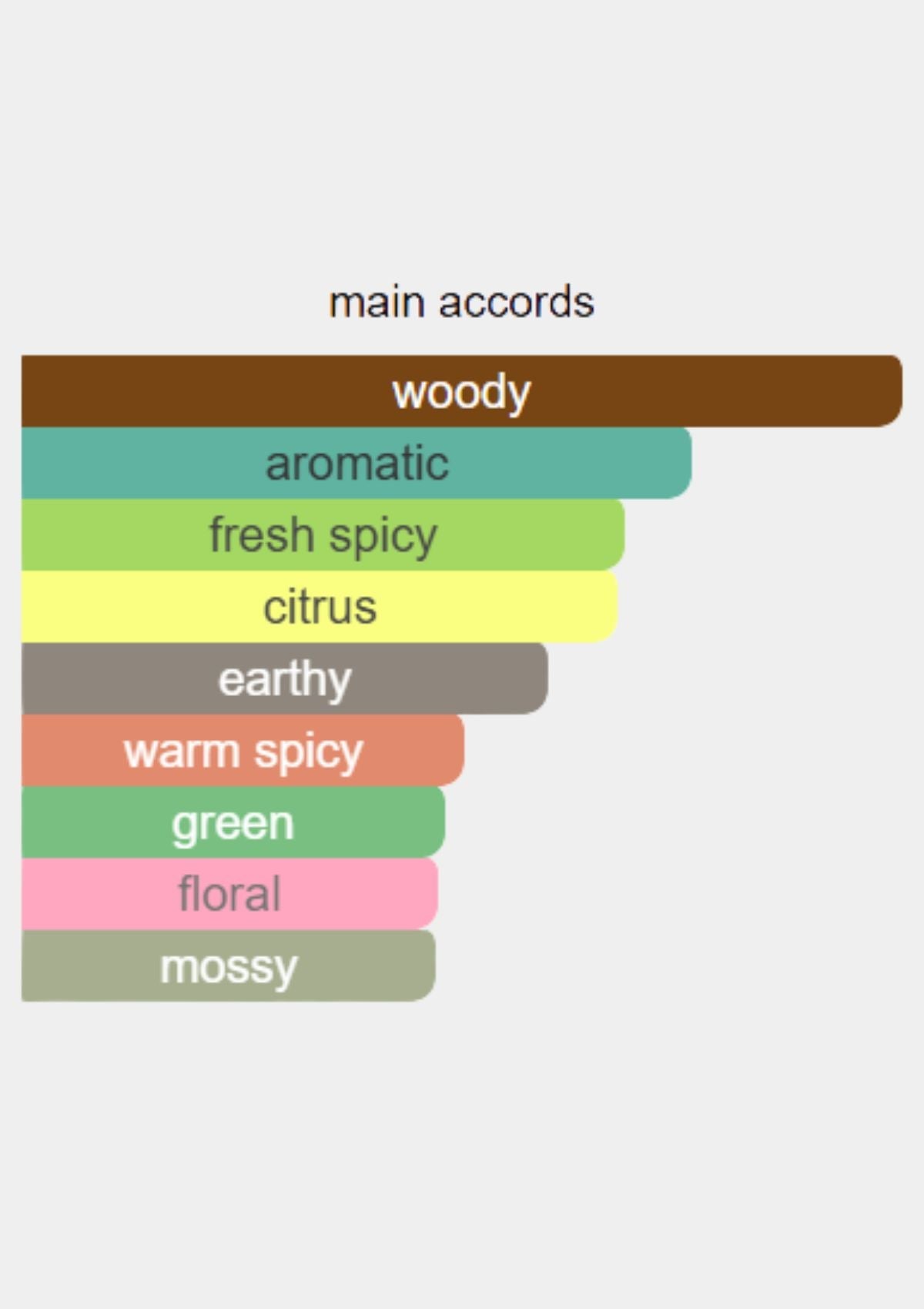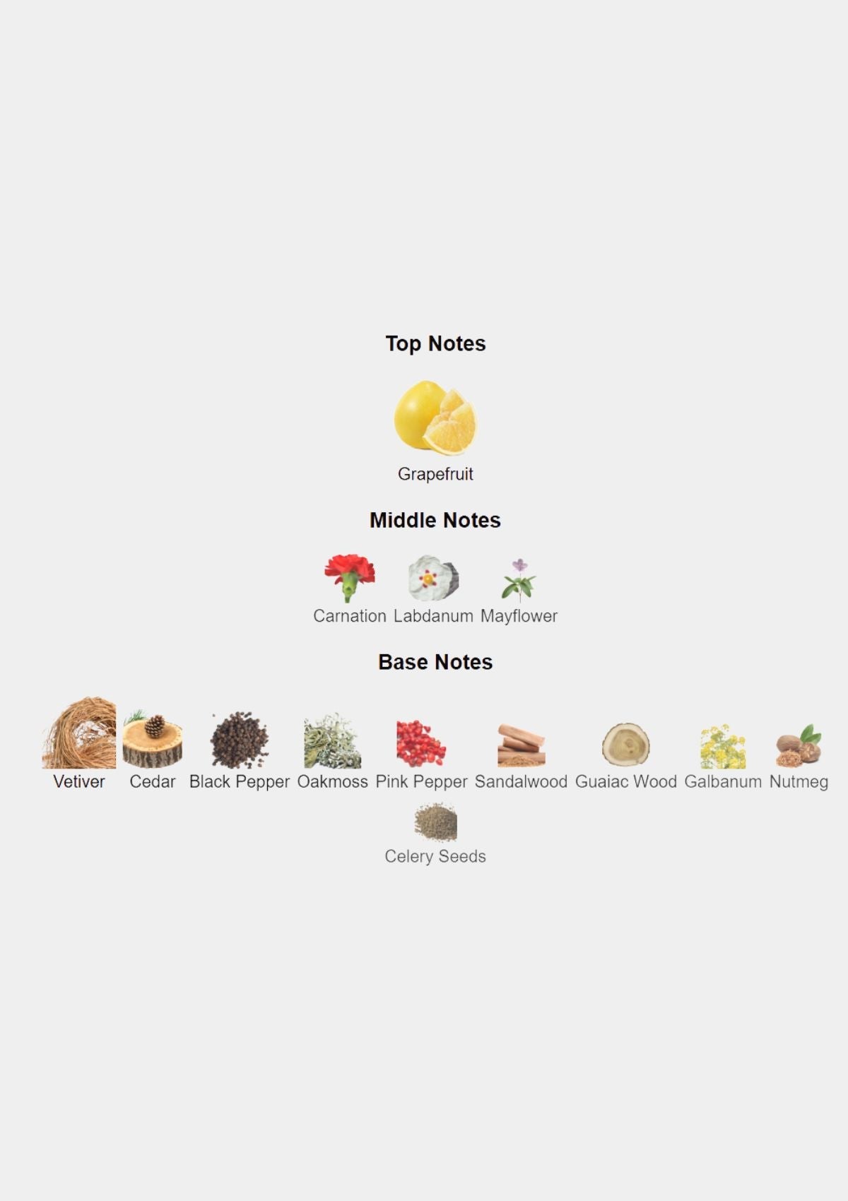 Base notes are Vetiver, Cedar, Black Pepper, Oakmoss, Pink Pepper, Sandalwood, Guaiac Wood, Galbanum, Nutmeg and Celery Seeds.
