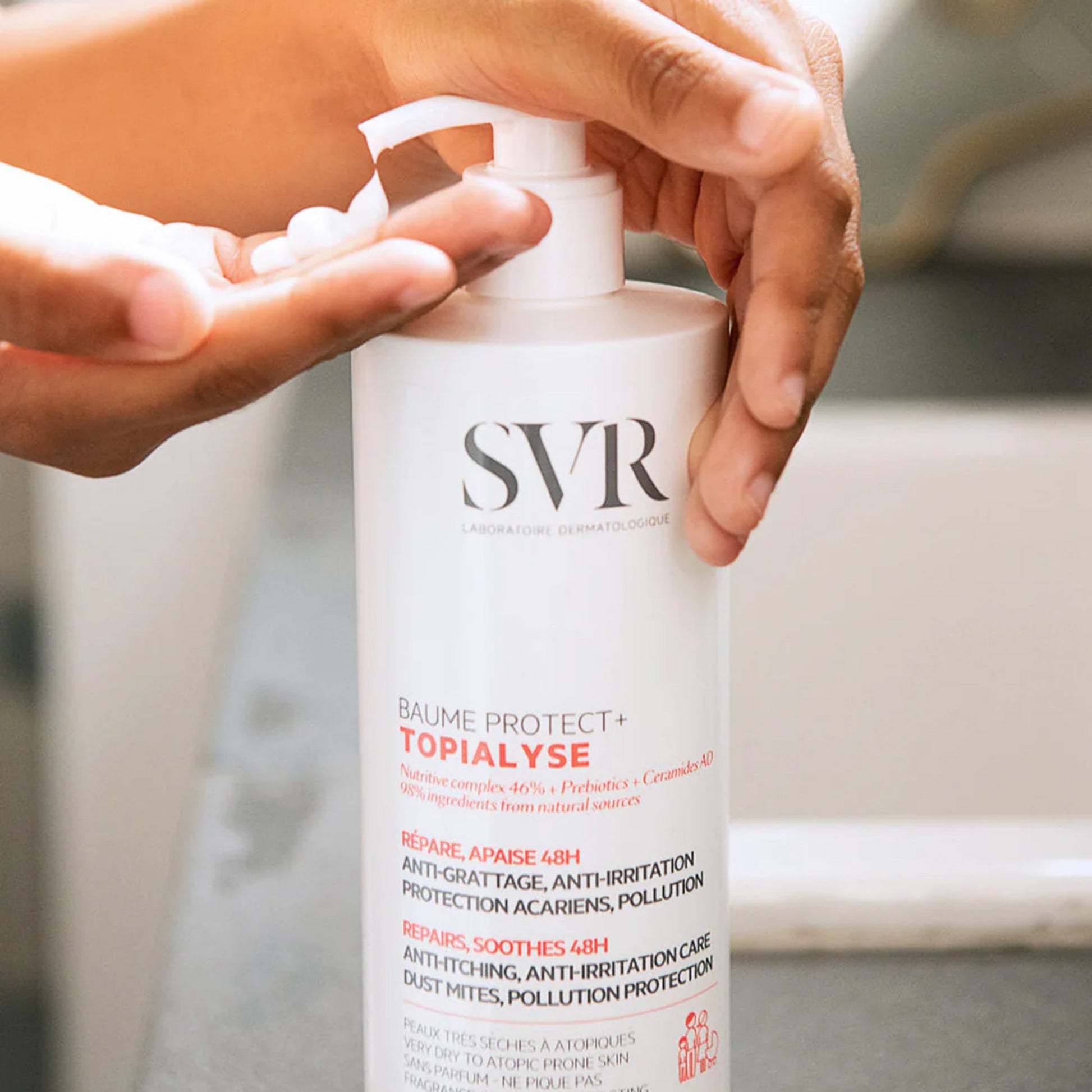 The Topialyse Baume Protect+ is a revolutionary body treatment cream that goes beyond just repairing and soothing itchy skin. This innovative product from SVR's Topialyse line is specifically designed to protect your skin from external aggressions such as dust mites and pollution, which can worsen irritation and scratching.