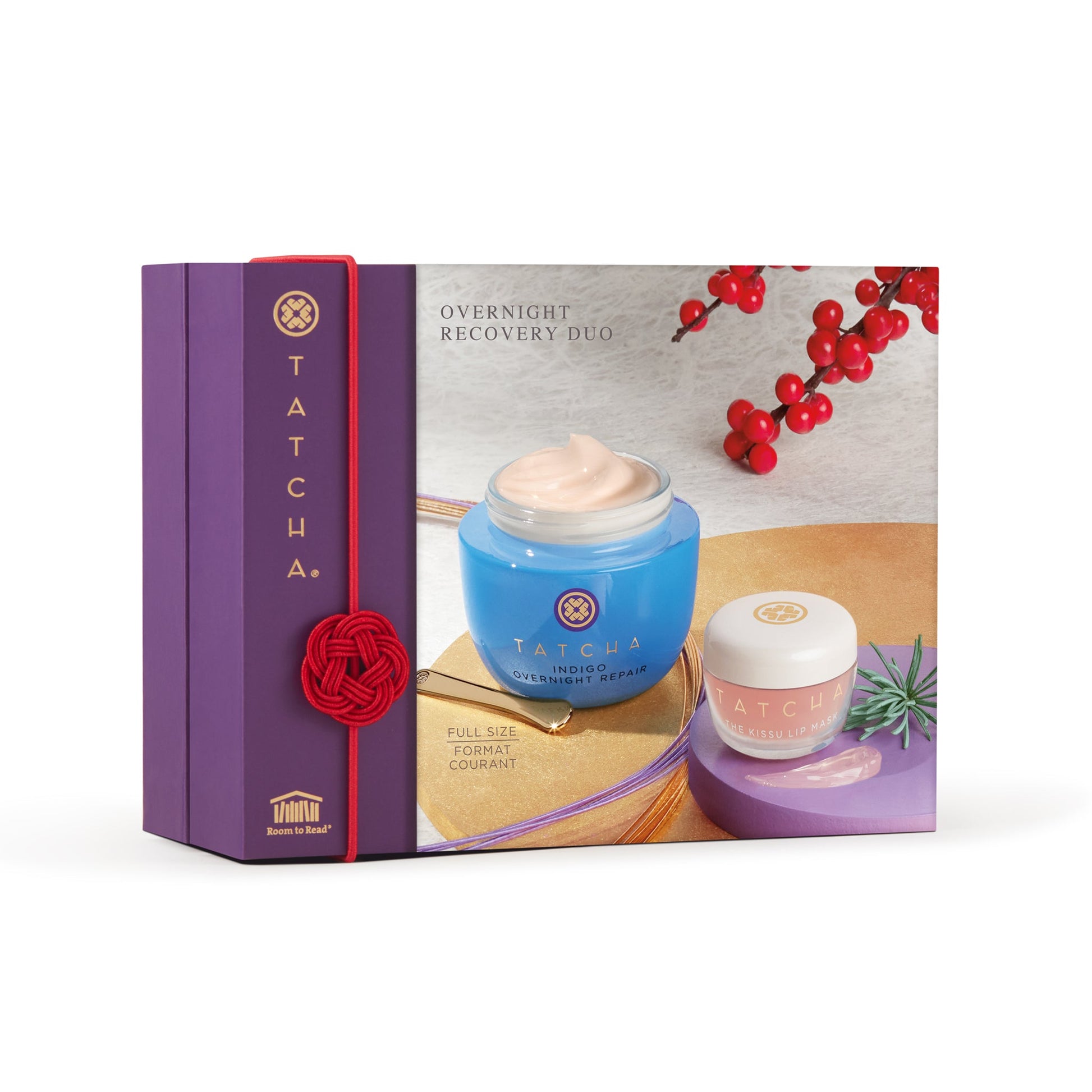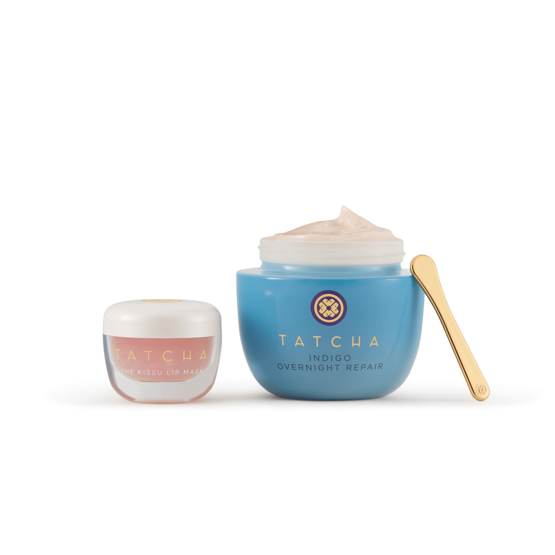 Tatcha presents Night Time Duo features an elegant, non-sticky jelly that melts into skin and layers on to comfort, hydrate, and lock in moisture. A cushiony, fragrance-free soothing serum-in-moisturizer treatment.